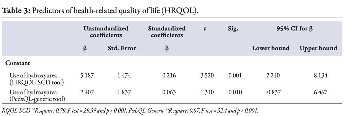Furthermore, the study identified the predictors of HRQOL, and hydroxyurea appeared as a significant predictor for the improvement of HRQOL in children with SCD. Compliance with the hydroxyurea drug