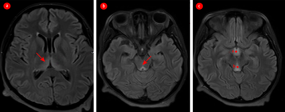 Figure 1: MRI of the brain showing symmetrically altered intensities of signals in the (a) medial and posterior aspects of both thalami, (b) periaqueductal grey matter, and (c) tectal plate.