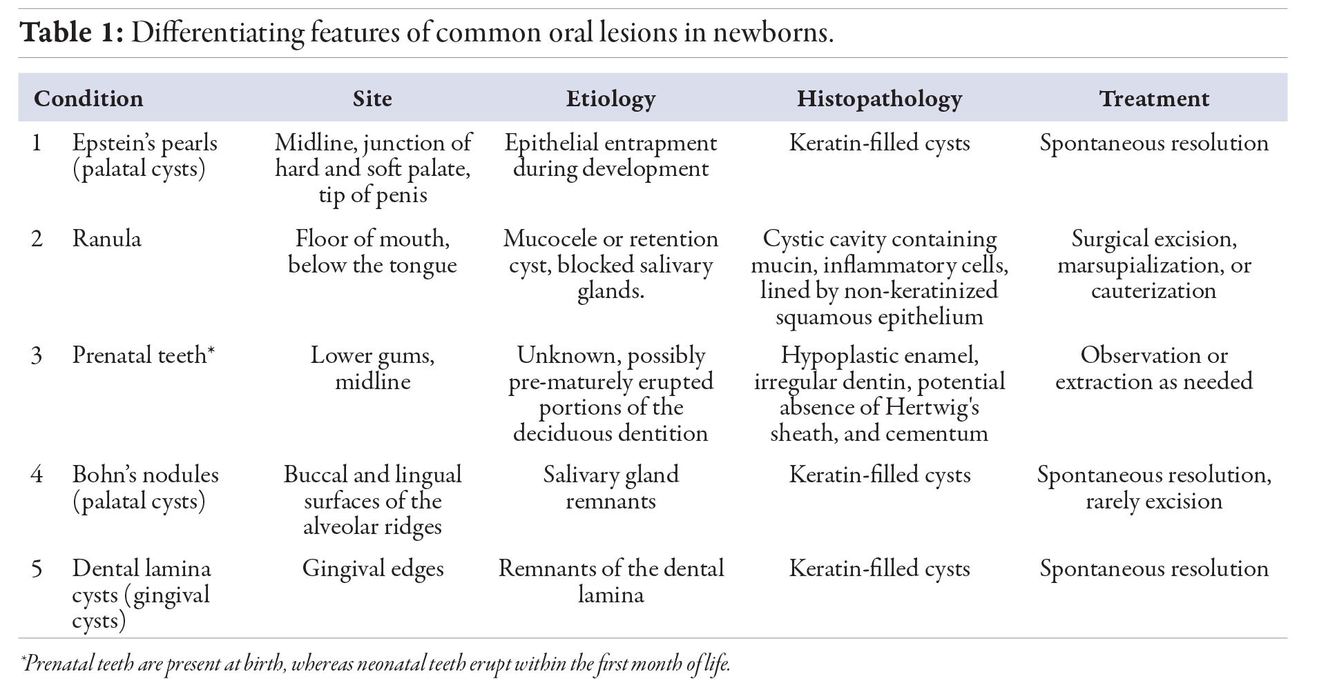 Bohn’s nodules are often confused with pustular lesions of the gums. However, careful examination reveals their keratin-filled nature, imparting a characteristic pearly appearance. They can be distinguished from common oral conditions such as natal teeth, congenital epulis, or ranula [Table 1].⁴ Bohn’s nodules regress within a few months of age and rarely require surgical excision. No treatment is necessary, and reassurance to parents is important.