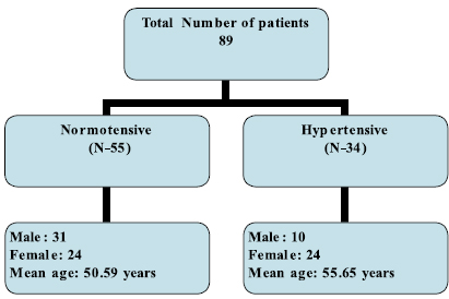 Age in the normotensive group varied from 26 years to 75 years (Mean: 50.59 years); and 29 years to 66 years (Mean: 55.66 years) in the hypertensive group. In the normotensive group we had 31 male patients and 24 female patients. While in the hypertensive group we had 10 male patients and 24 female patients. (Figure. 1)