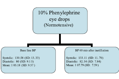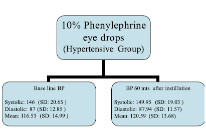 One drop of 10% phenylephrine was instilled into the conjunctival sac of both eyes at 10 minutes interval (twice). Base line blood pressure was recorded before instillation of 10% phenylephrine eye drops. A second reading was taken 60 minutes after instillation. To avoid bias, baseline blood pressure was recorded by one of the co-authors and 60 minutes after instillation, blood pressure was recorded by the other co-author. Both the results were kept secret till the end of the study. To avoid instrumental error, the same manual sphygmomanometer was used for all patients.