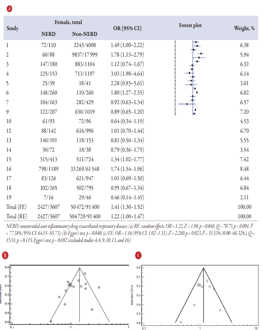 Figure 2: (a) Overview of the meta-analysis results of gender on NERD and non-NERD groups. (b) Funnel plot for 17 studies. (c) Funnel plot for 11 studies after excluding six studies with publication bias.