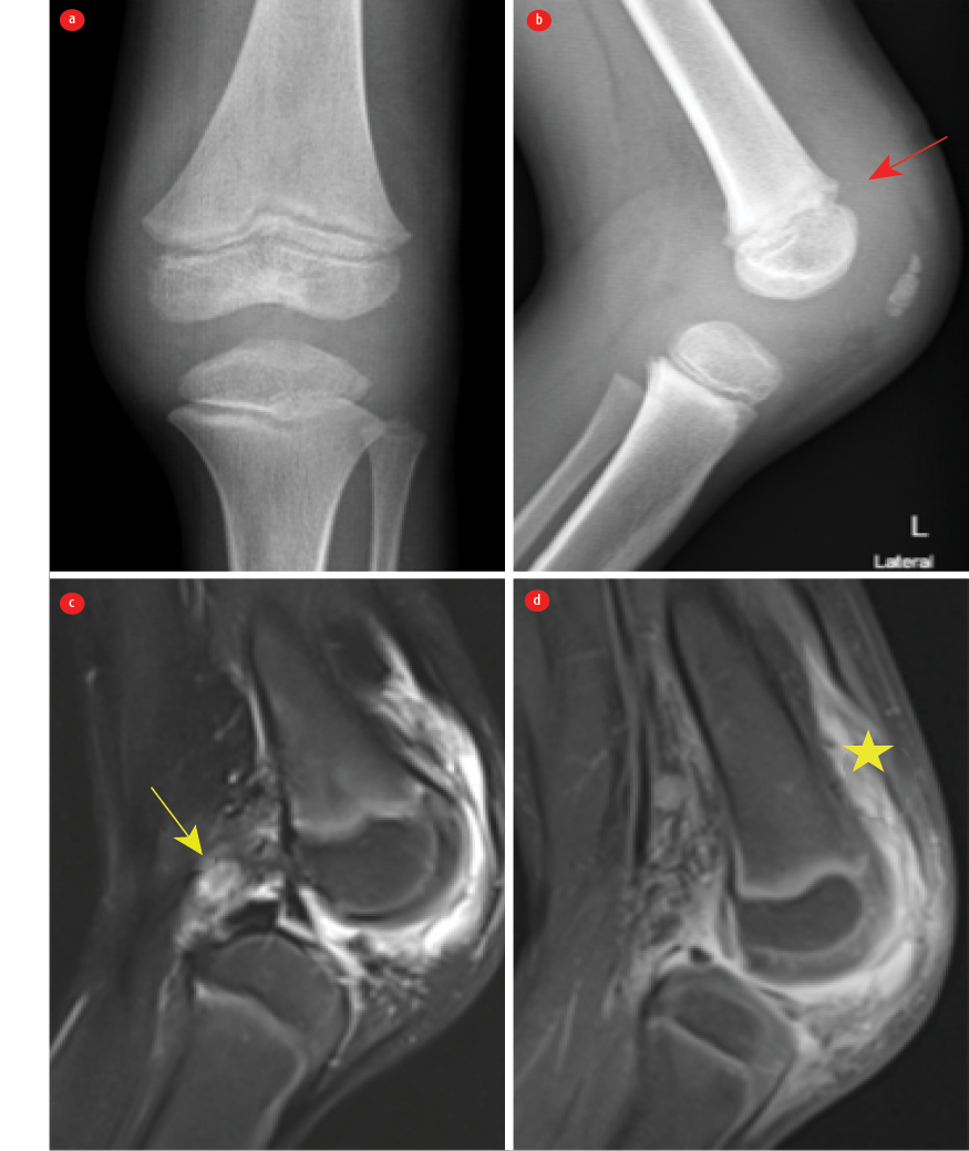 Figure 1: Radiographs of the left knee (a) anteroposterior and (b) lateral views revealed periarticular soft tissue swelling, which is better seen on the lateral radiograph. We observed suprapatellar pouch effusion (red arrow). No fractures or destructive bony lesions were observed, and the joint space was preserved. (c) Sagittal T2 FS MRI of the knee showing enlarged lymph nodes in the popliteal fossa were also noted (yellow arrow). (d) Post-contrast T1 FS MRI of the knee revealed a small knee joint effusion with synovial thickening and periarticular soft tissue edema. There was thick enhancing synovium on the post-contrast images (star).