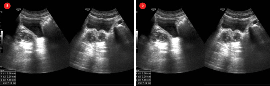Figure 2: Ultrasonographic images of the abdomen. (a) Hepatosplenomegaly, prostatomegaly with abscess formation. (b) Multiple splenic microabscesses are seen.