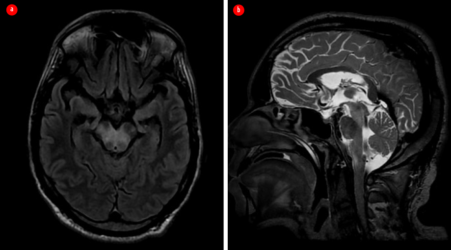 Figure 4: Repeated contrast-enhanced MRI after the second relapse. (a) Axial T2 fluid attenuated inversion recovery image. (b) Sagittal T2-weighted image shows new-onset hyperintensity involving the ventral aspect of pons and medulla.