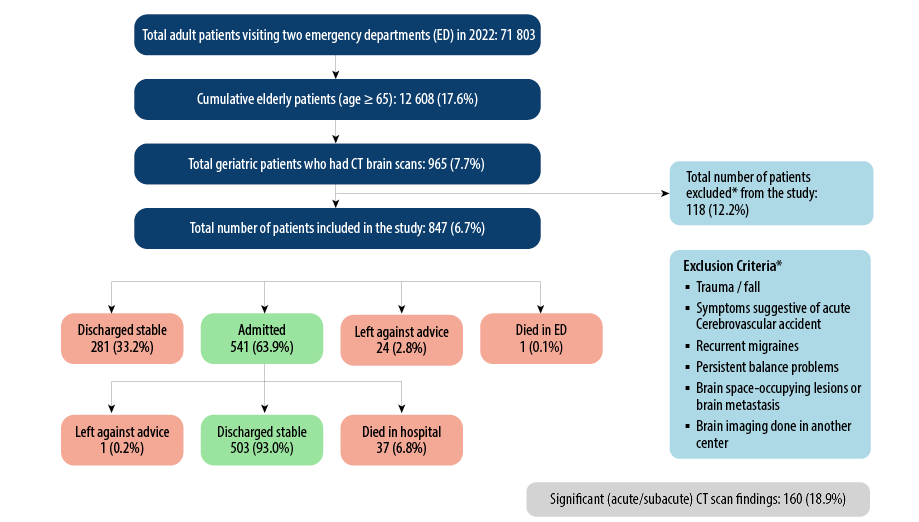 Calhoun et al,10 found a 3.2% prevalence of acute intracranial abnormalities on CT brain imaging in elderly patients with generalized weakness. To achieve a precision of 1.2% and a 95% CI, approximately 829 patients were needed for the study. Clinical data, including age, sex, presenting complaints, vital signs, laboratory results, and radiological findings (e.g., chest radiographs), were entered into a standardized data collection sheet. The primary investigator supervised the process, and an interim analysis was conducted to minimize data entry errors.