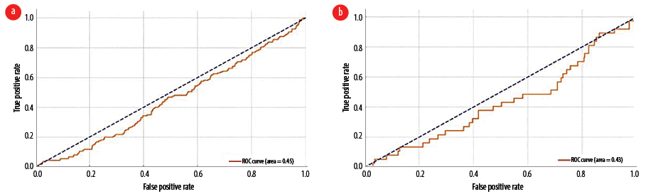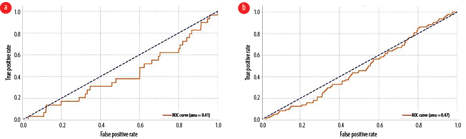 Figure 3: Receiver operating characteristic curve and area under the curve analysis of CT scan in detecting (a) significant new and/or acute CT findings and (b) newly detected space-occupying lesions.