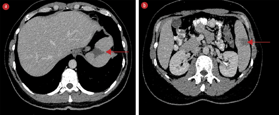 Figure 1: Axial contrast-enhanced CT scan demonstrating wedge-shaped hypodense splenic lesions without contrast enhancement indicative of splenic infarcts (red arrows), (a) located at the T10 level and at (b) the