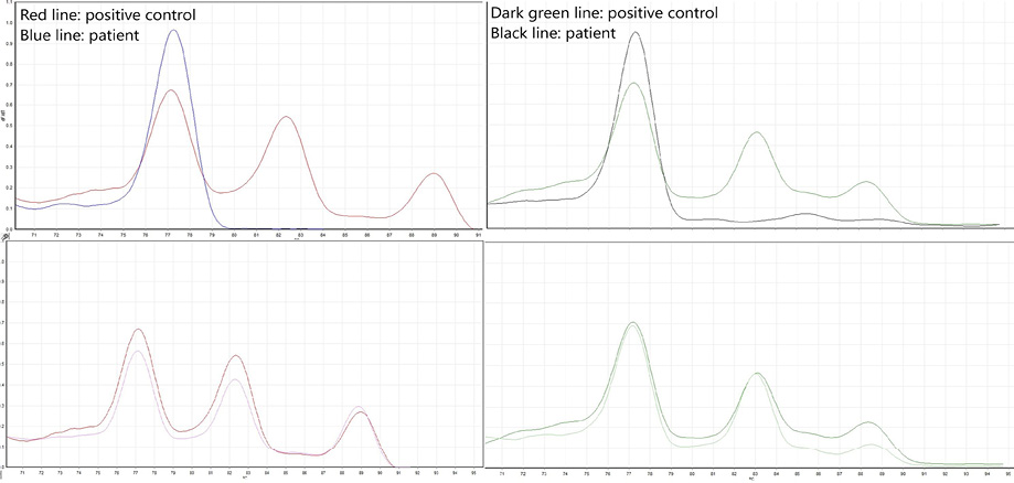 Figure 1: Representative real-time polymerase chain reaction melting curves for HLA-DQ2 and HLA-DQ8 genotyping, showing individual sample traces compared with assay positive controls to determine haplotype positivity or negativity. (a) HLA-DQ2 negative sample showing a single peak not corresponding to the positive control. (b) HLA-DQ2 positive sample showing a characteristic three-peak pattern matching the positive control. (c) HLA-DQ8 negative sample with a single non-matching peak. (d) HLA-DQ8 positive sample demonstrating a three-peak pattern consistent with the positive control.
