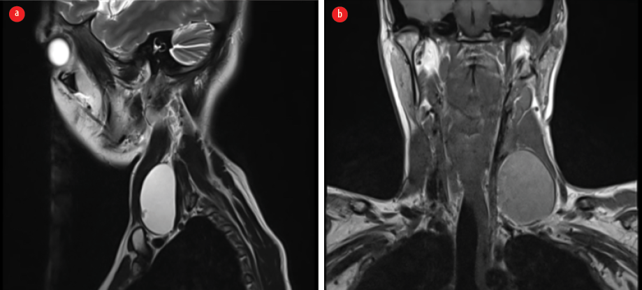 Figure 1: (a) MRI showing a heterogeneous swelling in the midline of the neck, and (b) in the left lateral part of the neck.