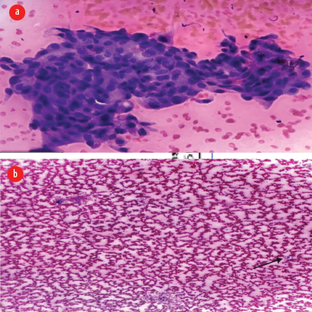Figure 2: (a) Fine-needle aspiration cytology showing tiny clusters of benign epithelial cells and (b) tiny clusters along with cyst macrophage (black arrow).