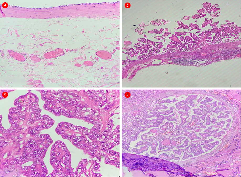 Figure 4: (a) Section from cyst wall shows benign epithelial lining, hematoxylin and eosin (H & E) magnification = 2 ×. (b) Section from cyst wall showing papillary projections that are lined by malignant cells, H & E magnification = 4 ×. (c) High power view showing classical papillary carcinoma nuclear features, H & E magnification = 40 ×. (d) Section from thyroid showing small focus of papillary carcinoma in the thyroid, H & E magnification = 10 ×.