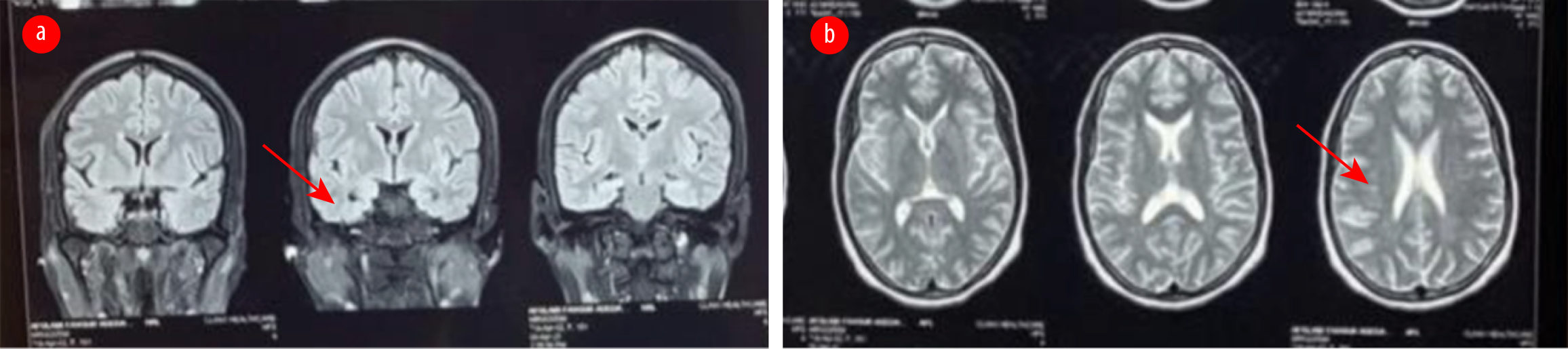 Figure 1: MRI of the brain show (a) normal mesial temporal lobe (arrow) in the fluid attenuated inversion recovery coronal image, and (b) few sub-cortical white matter hyperintensities (arrow) in the T2-weighted sequence.